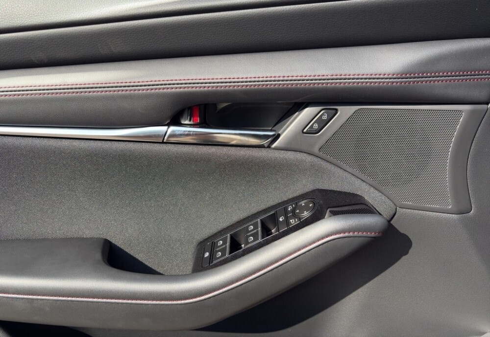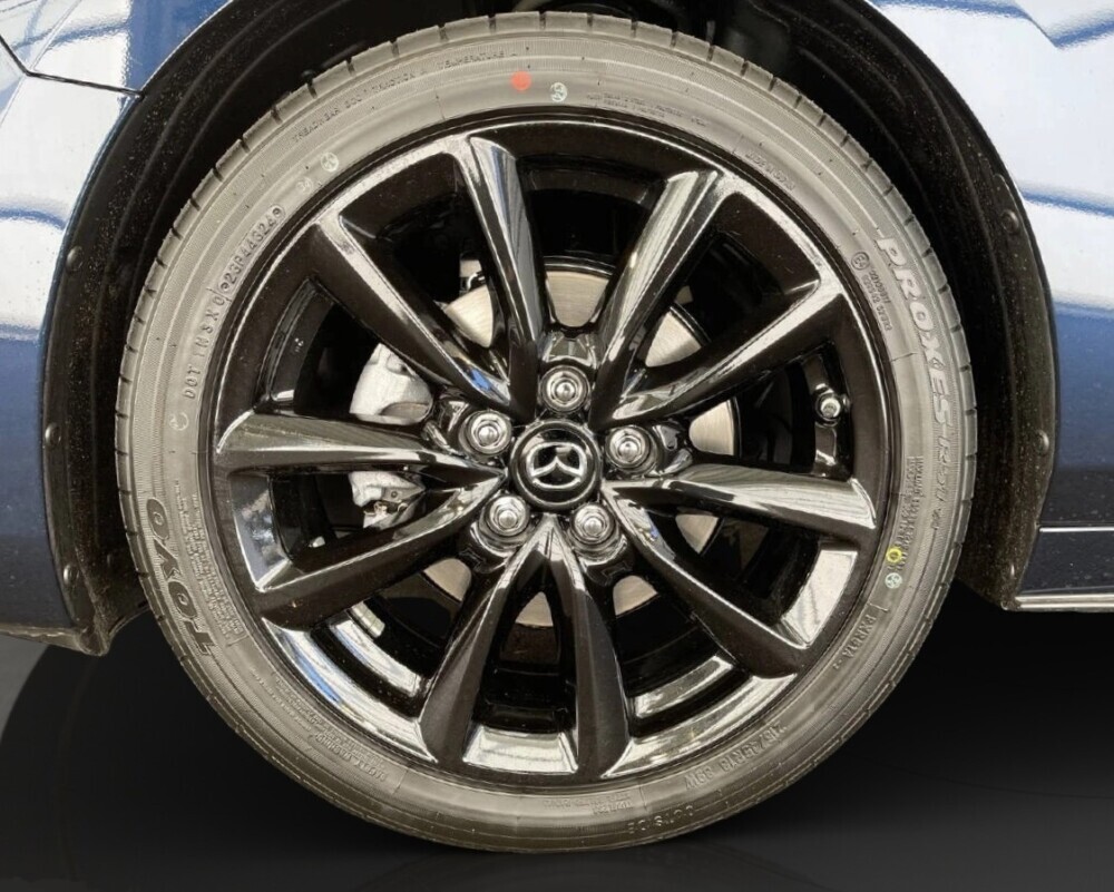 La finition Homura incarne l’élégance sportive de Mazda, avec ses jantes noires, ses rétroviseurs contrastés et son habitacle aux surpiqûres rouges.